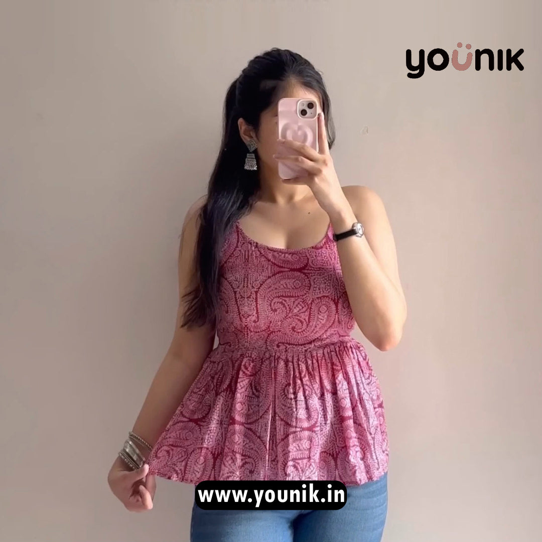 Elevate your everyday look with this Maroon Paisley Peplum Top. Crafted from soft, breathable cotton,The cinched waistline flatters your silhouette, while wide straps and a scoop neckline offer all-day comfort. Pair it with denim, skirts, or ethnic bottoms for a casual yet graceful style statement.