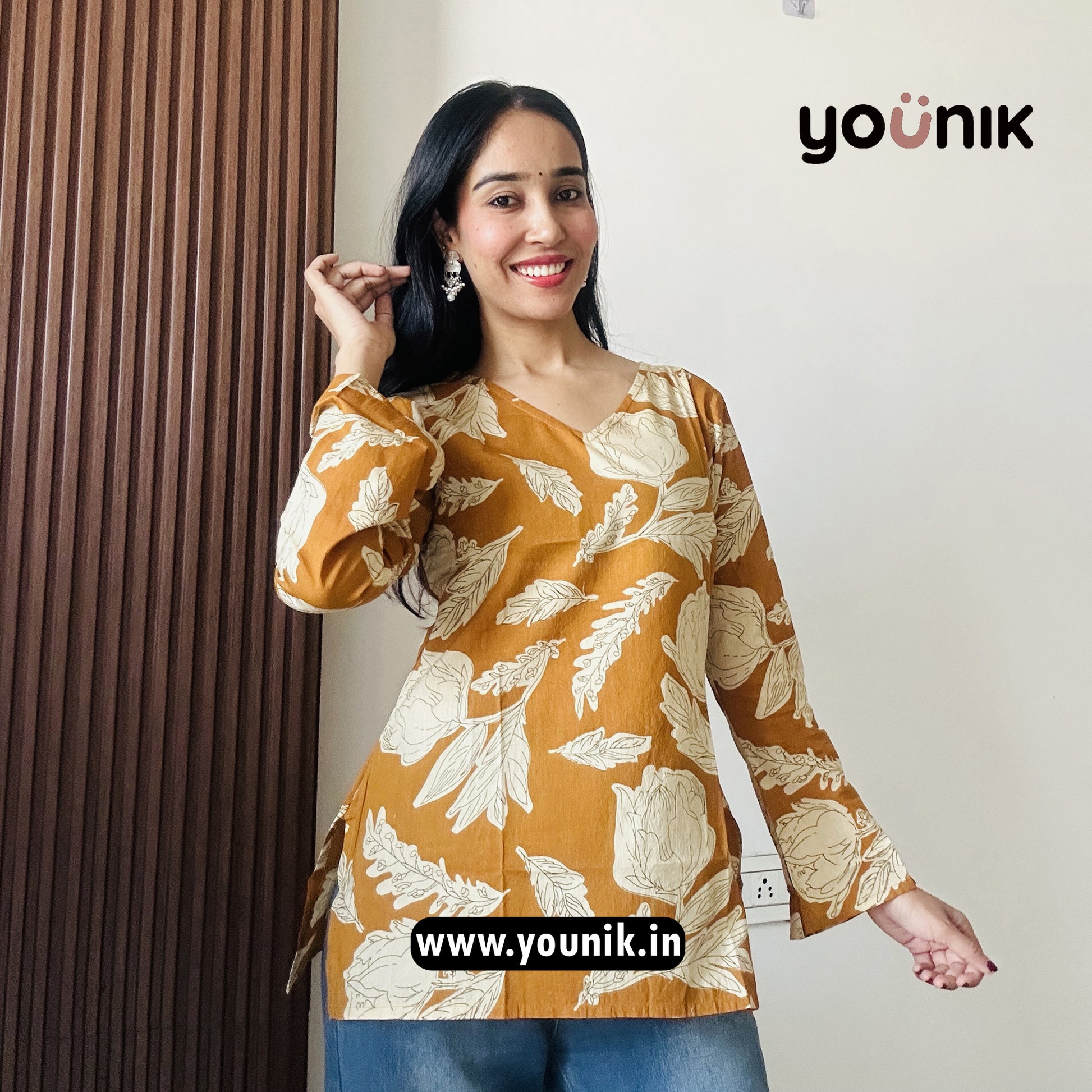 Brighten up your everyday look with this Mustard Floral Printed Short Kurti from Younik, a perfect blend of comfort and style. Made from premium Cambric Cotton (Poly Cotton) fabric, this kurti feels soft against the skin and offers excellent breathability, making it ideal for all-day wear.