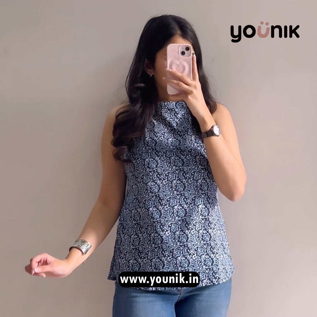 Navy Blue All Over Printed Pure Cotton Halter Neck Short Kurti