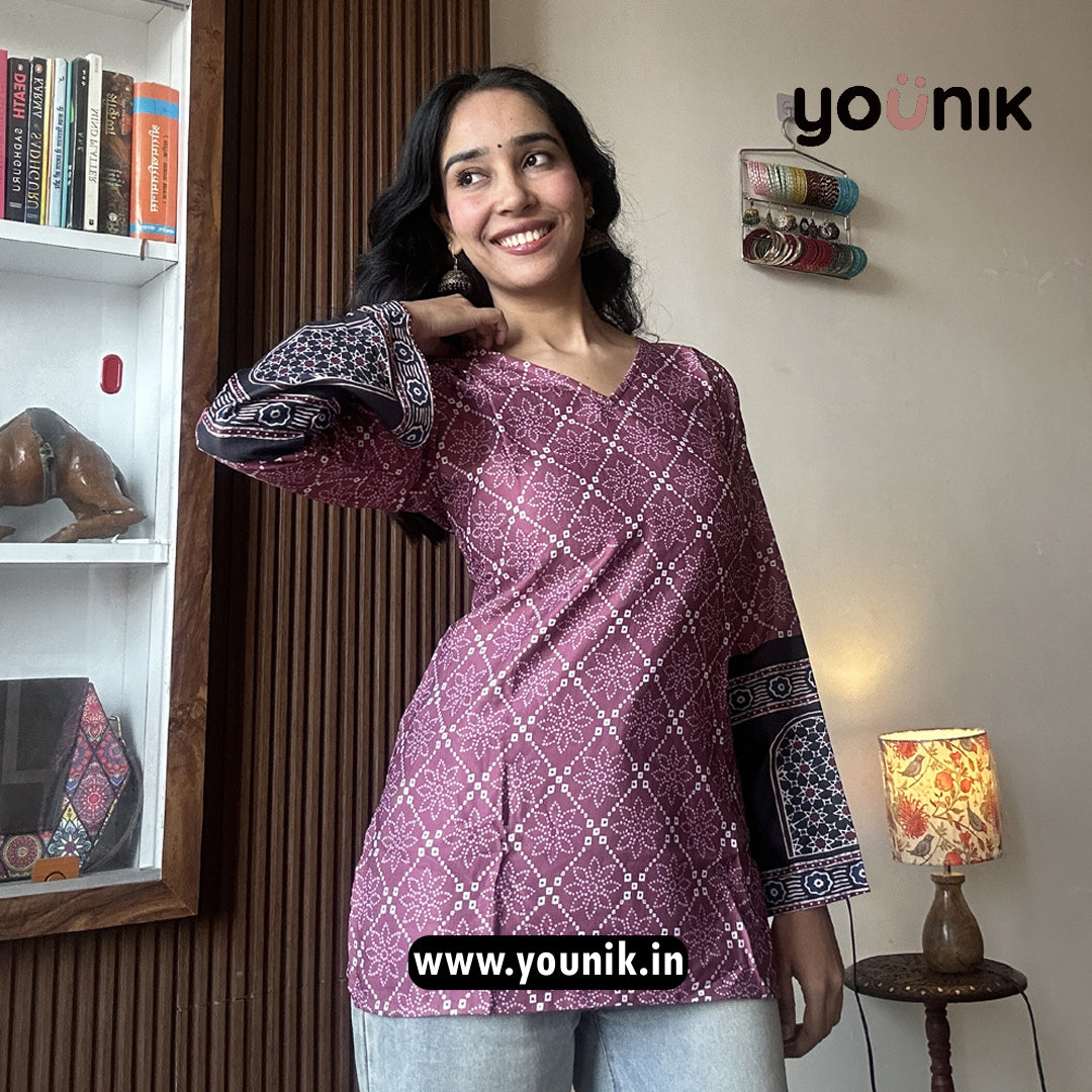 Purple Bandhani Printed Bell Sleeve Corset Back Short Kurti